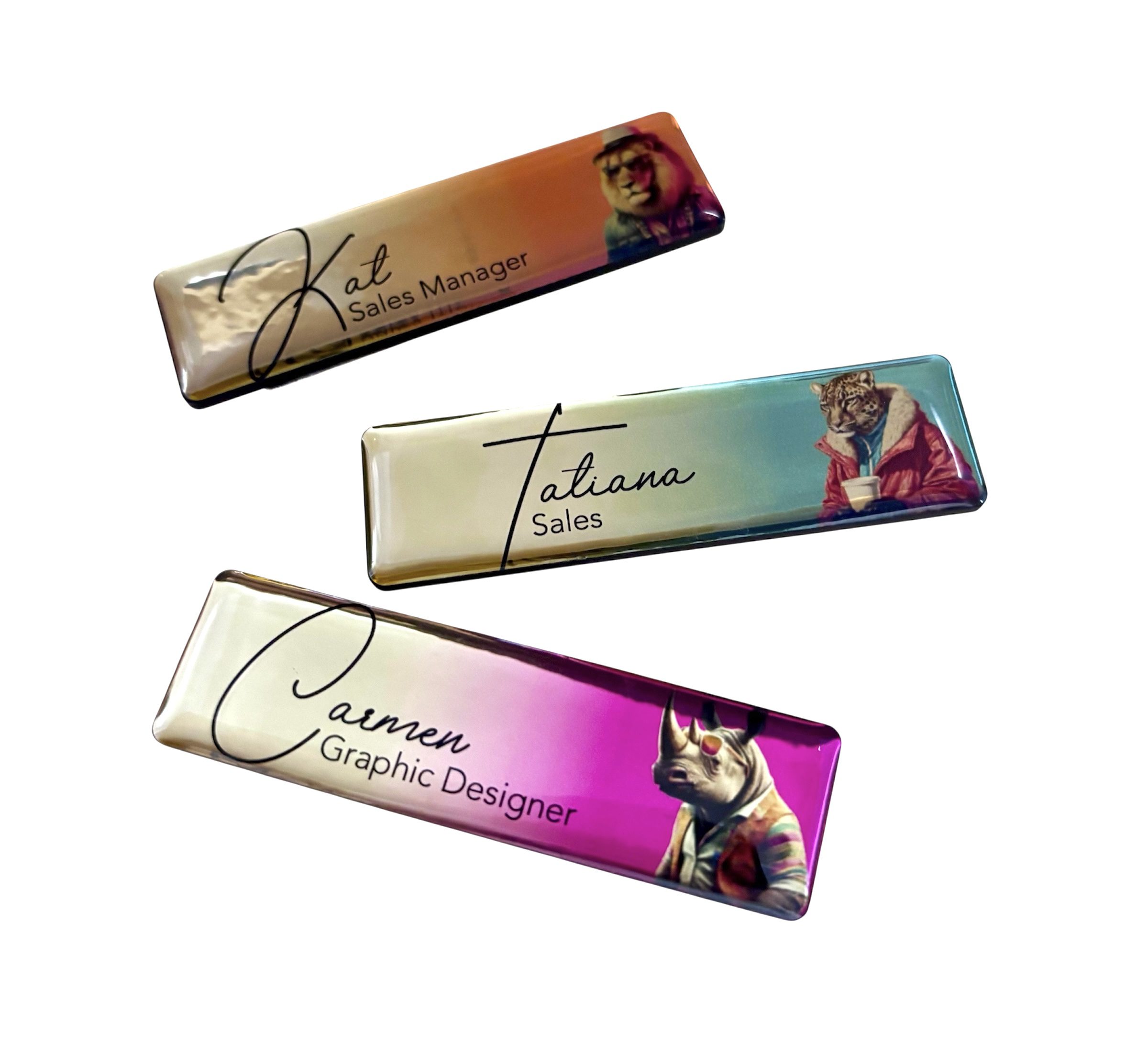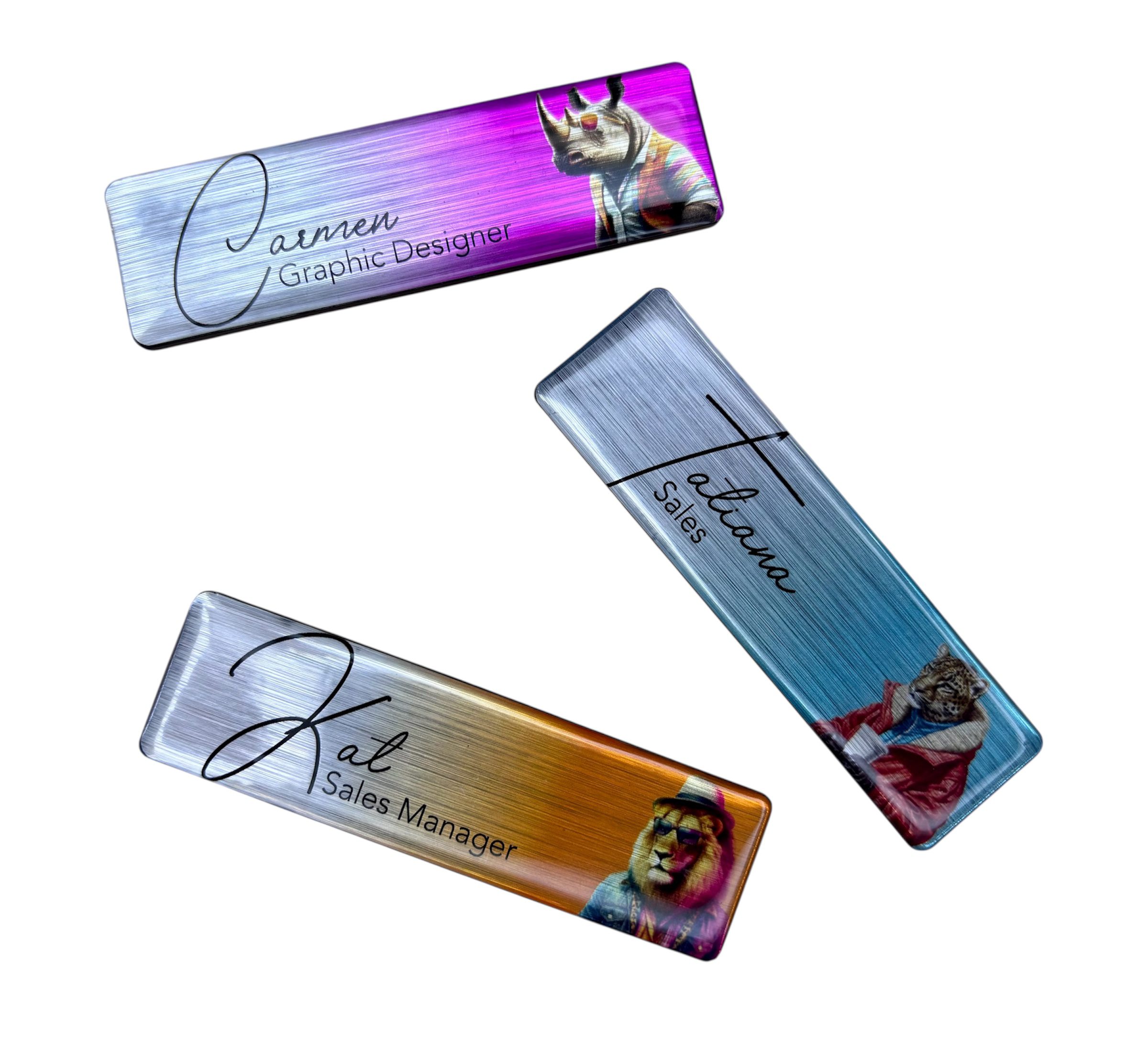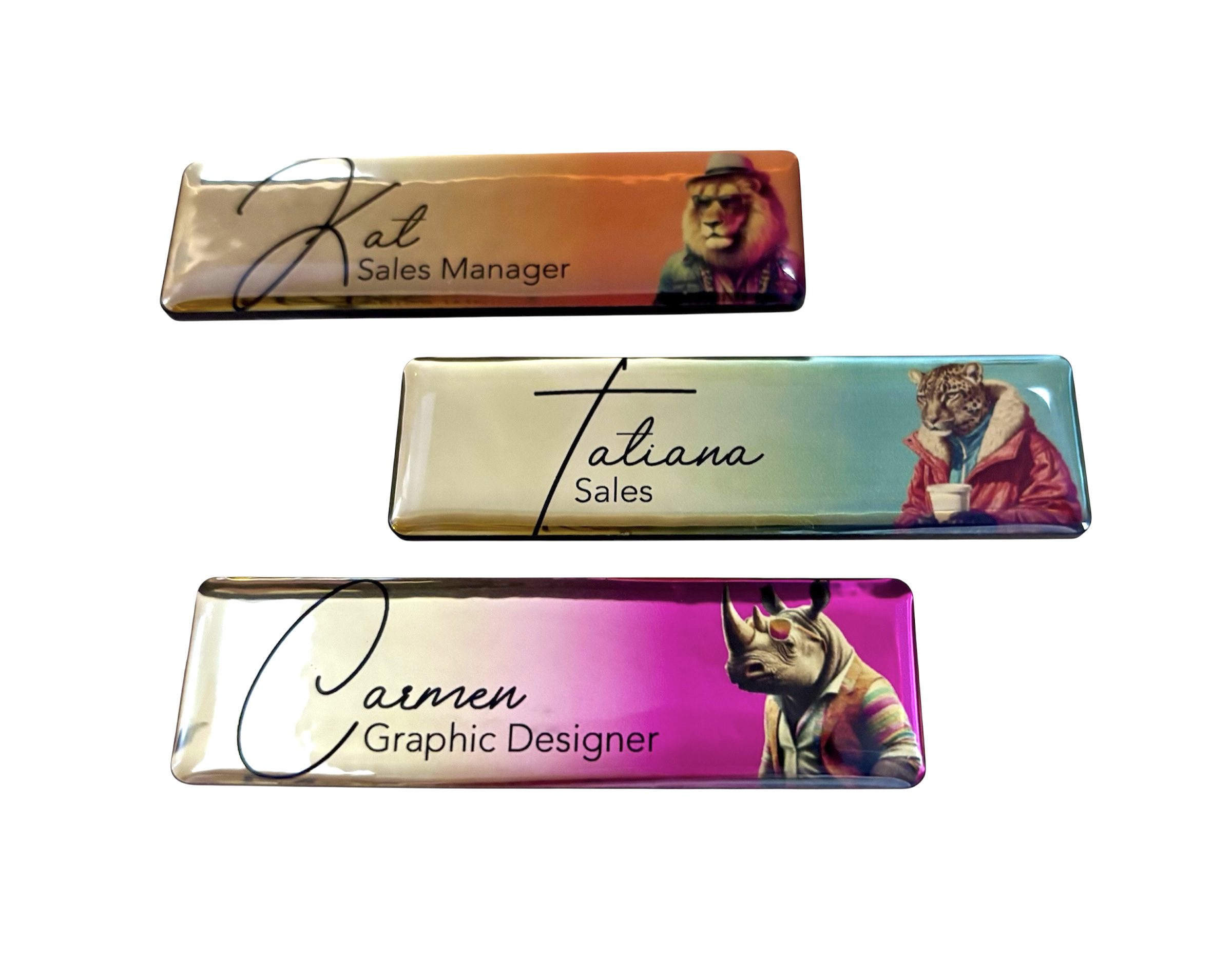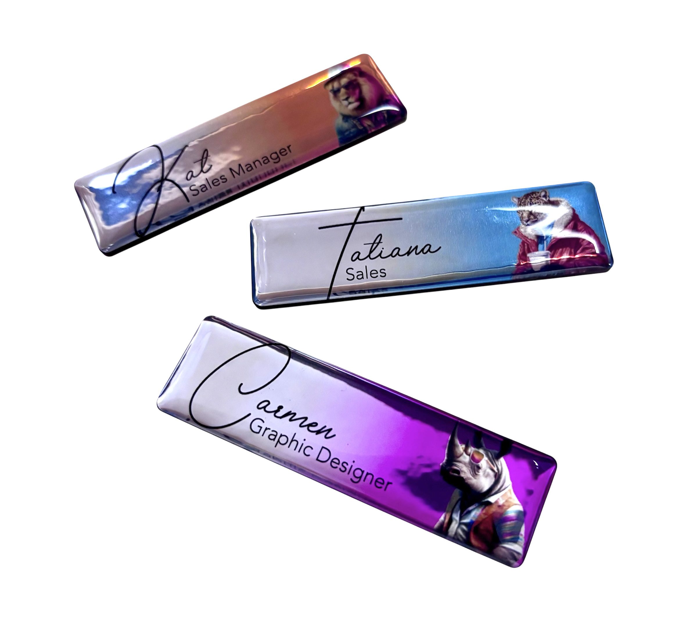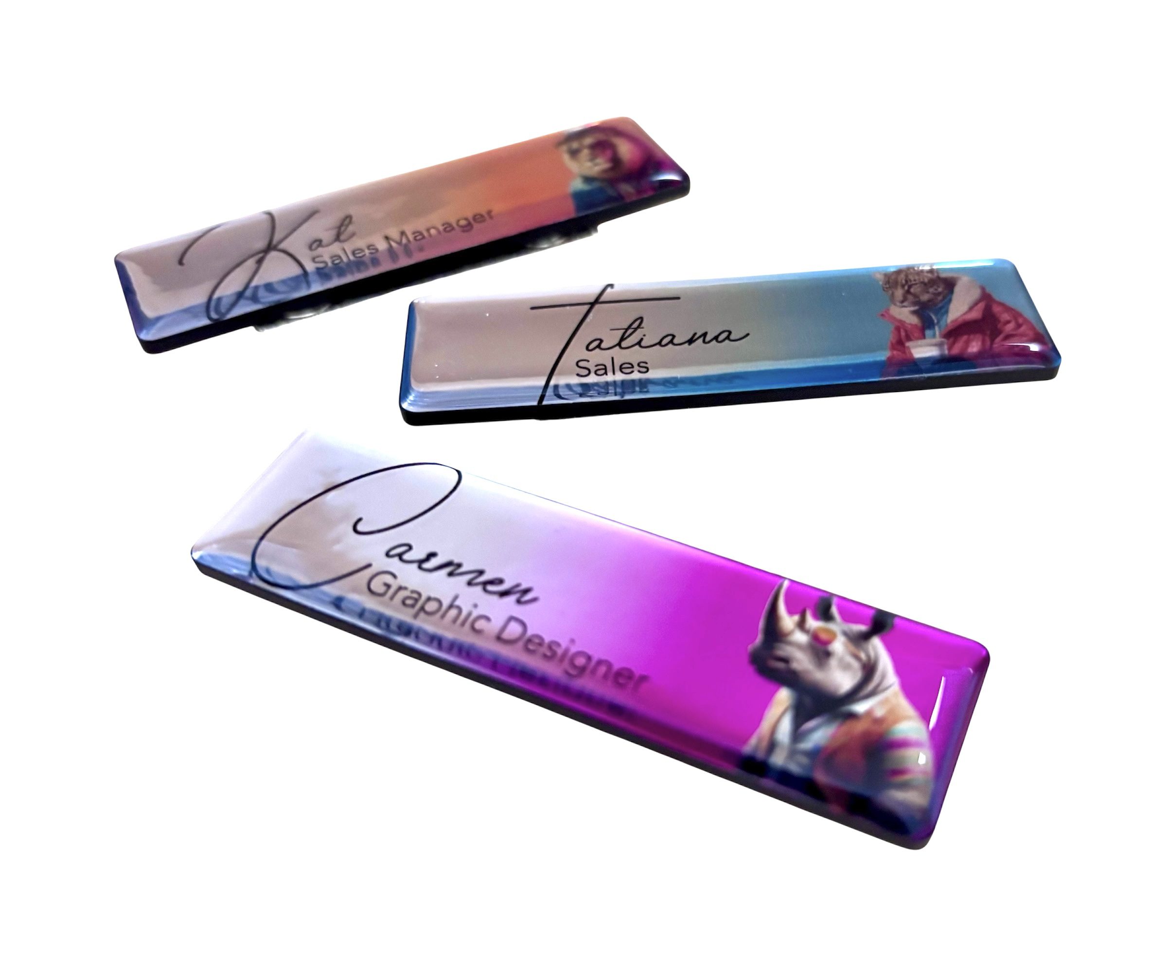 Our premium 70mm x 20mm name badges are crafted for a sleek and professional look. Each badge features a durable ABS back with a domed vinyl sticker applied for a glossy, long-lasting finish.