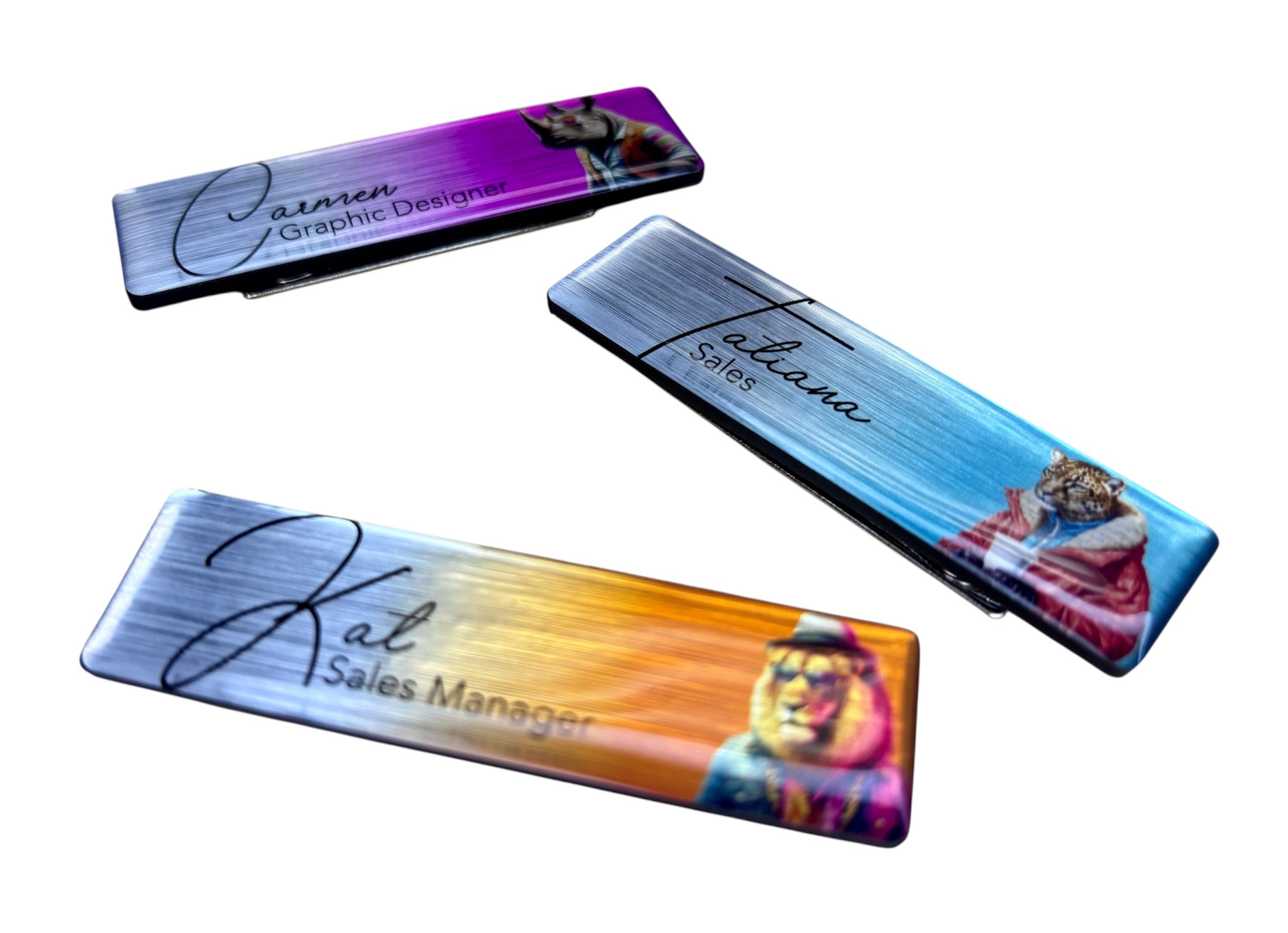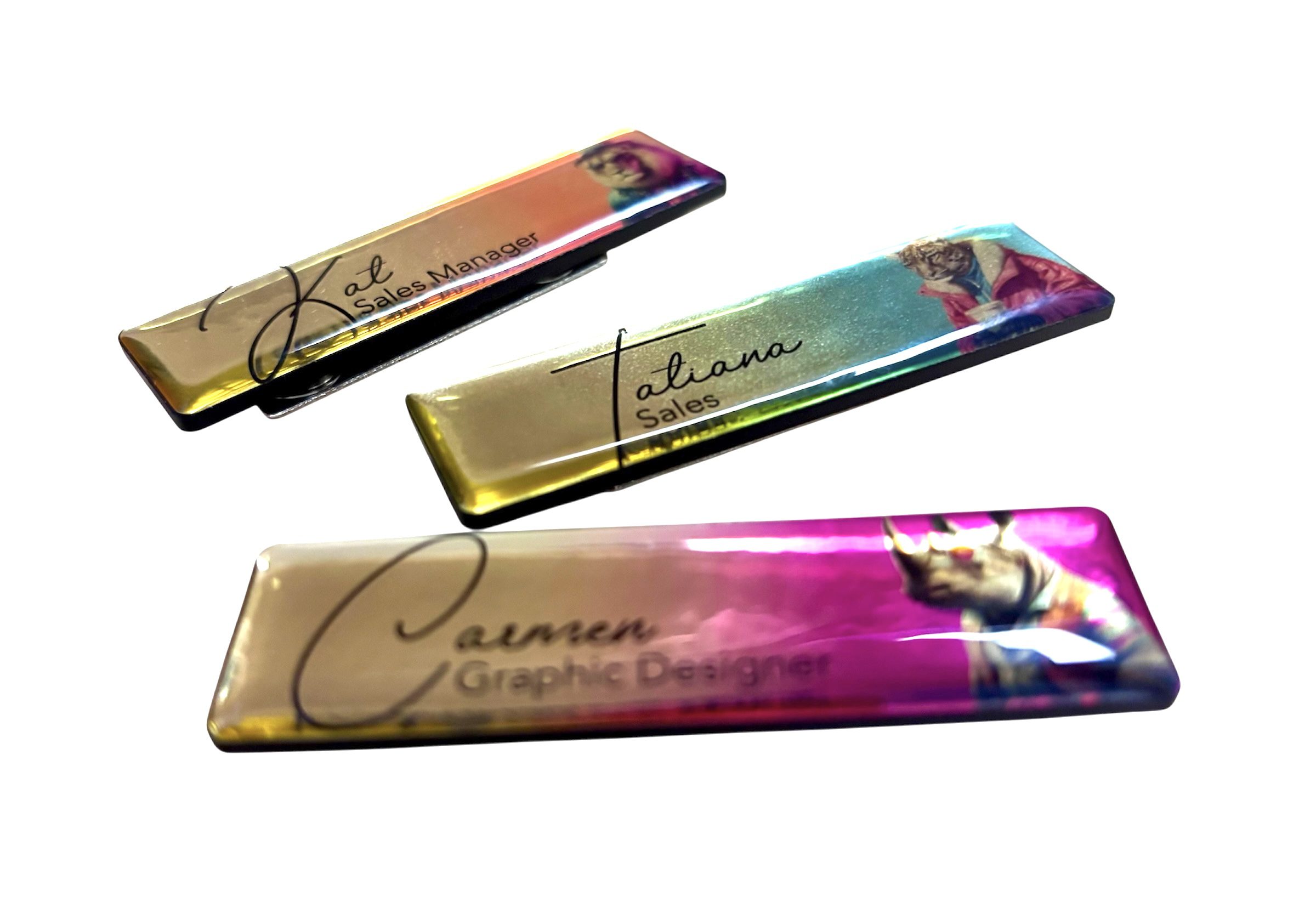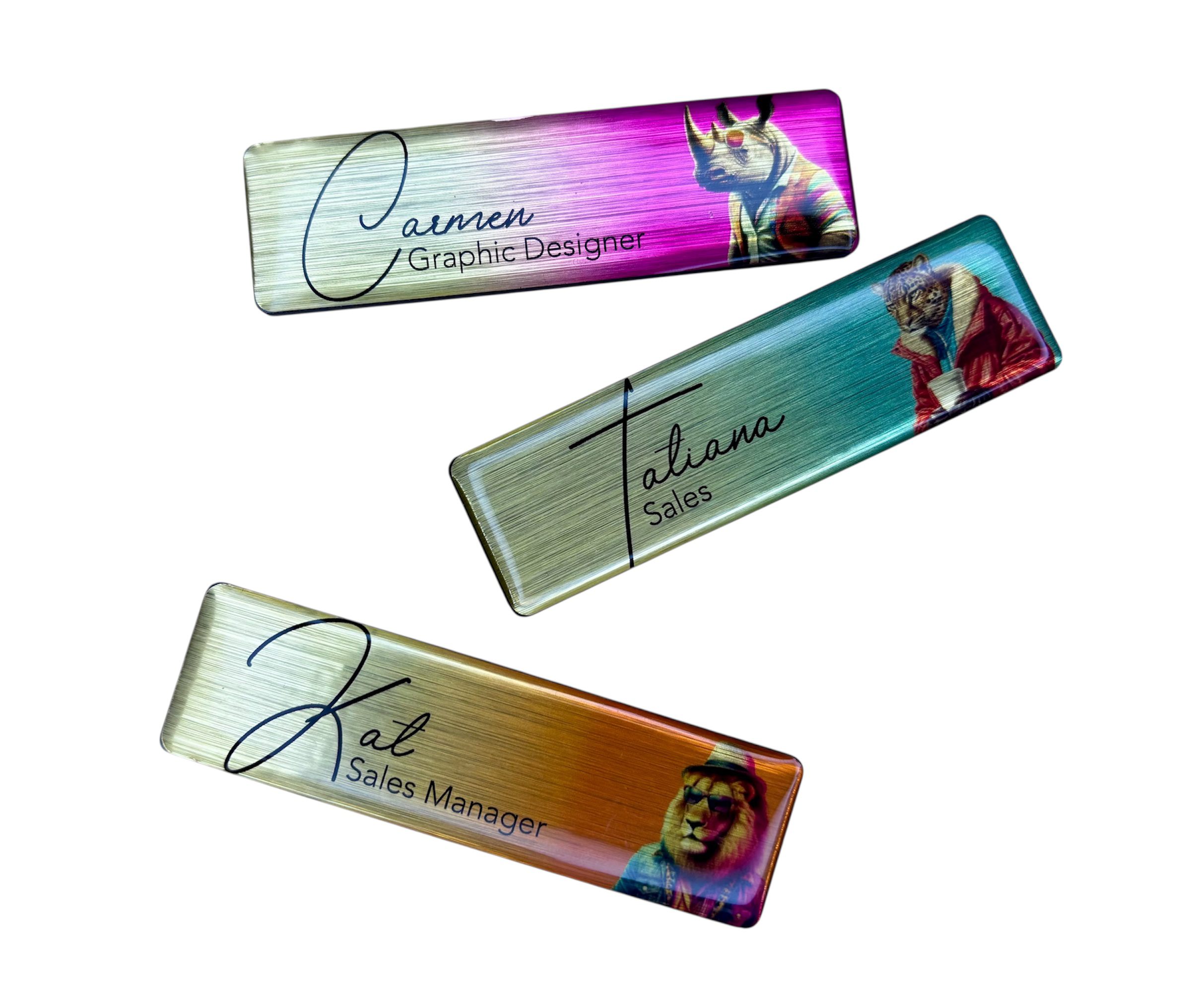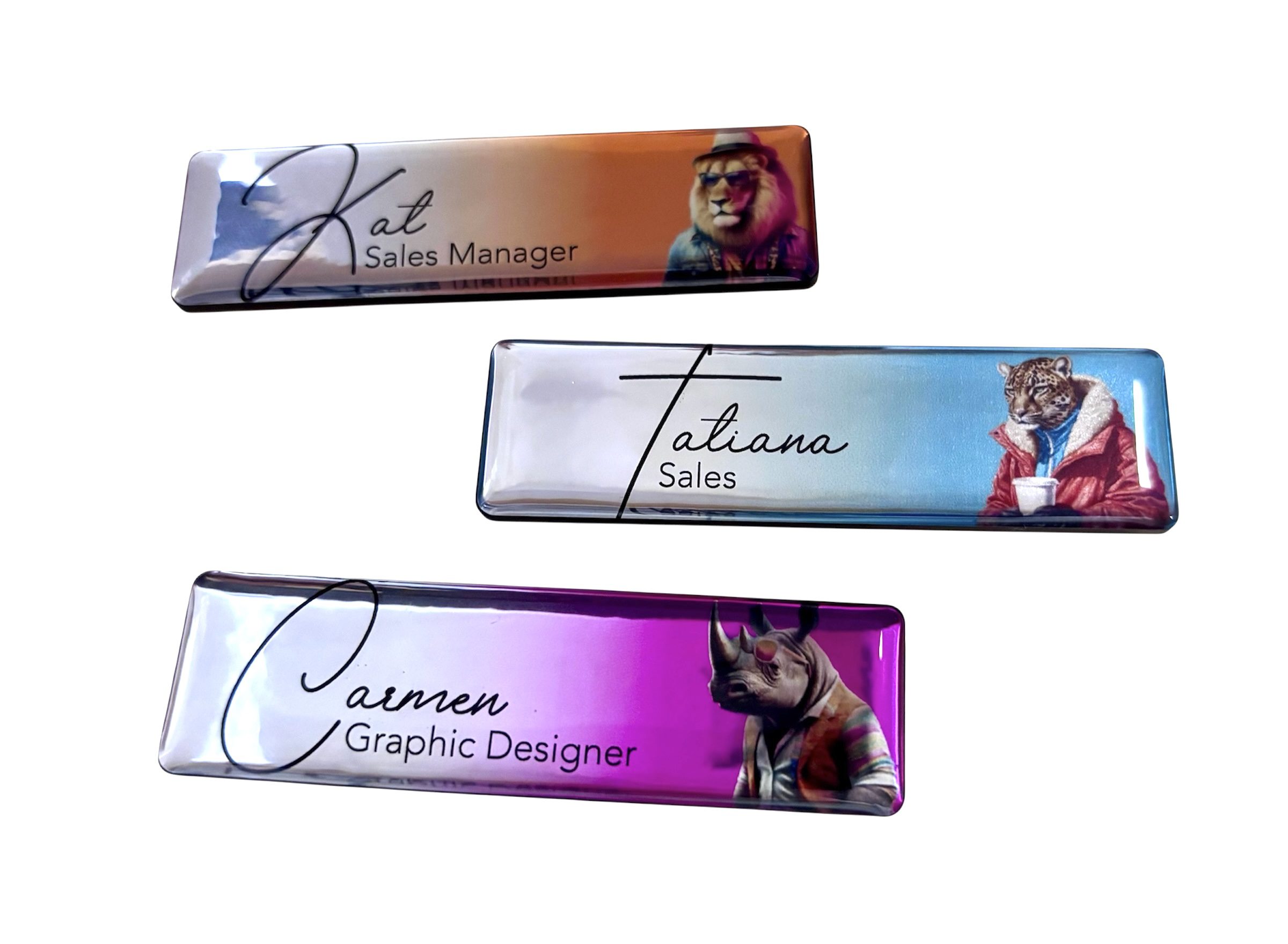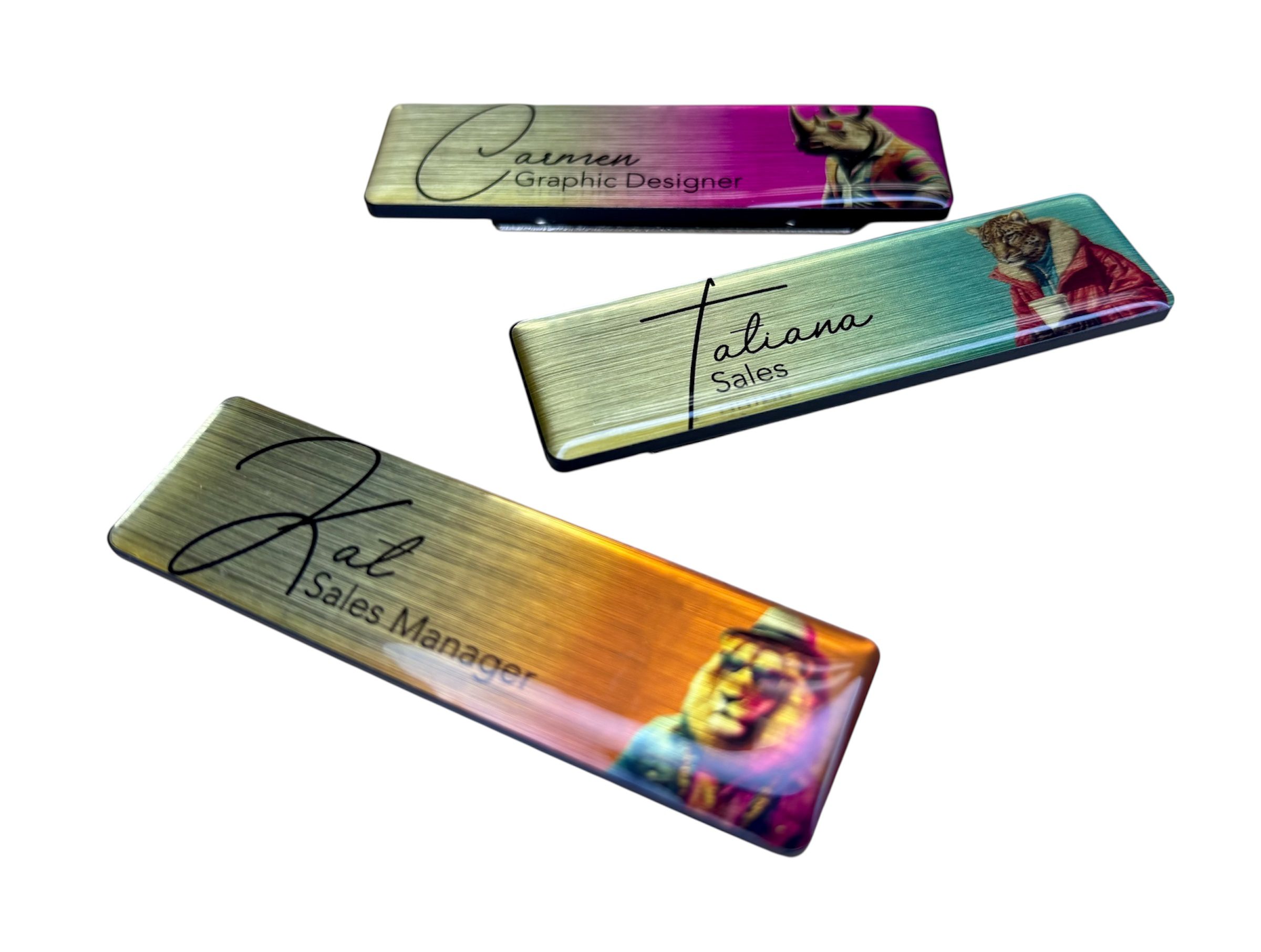 Our premium 70mm x 20mm name badges are crafted for a sleek and professional look. Each badge features a durable ABS back with a domed vinyl sticker applied for a glossy, long-lasting finish.